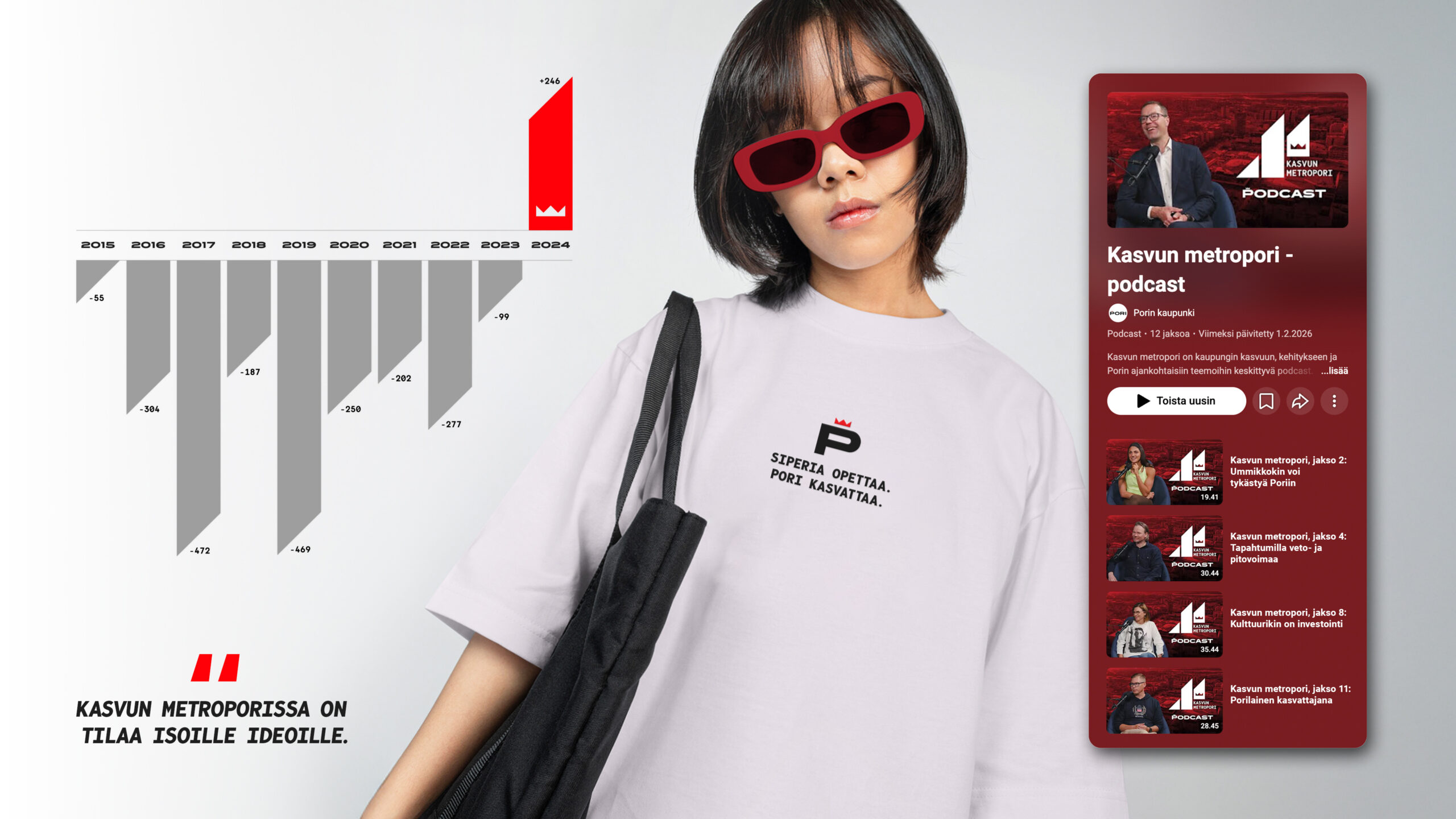 Porin tulevaisuuskuva oli vuosia ollut alavireinen. Asukasluku laski, työpaikkoja katosi ja nuorten pitovoima oli heikko. Kaupunki tarvitsi viestinnällisen peruskiven, joka palauttaa uskon kasvuun ja kannustaa tekoihin – niin kaupunkilaisilta, yrityksiltä kuin poliittisilta toimijoiltakin.